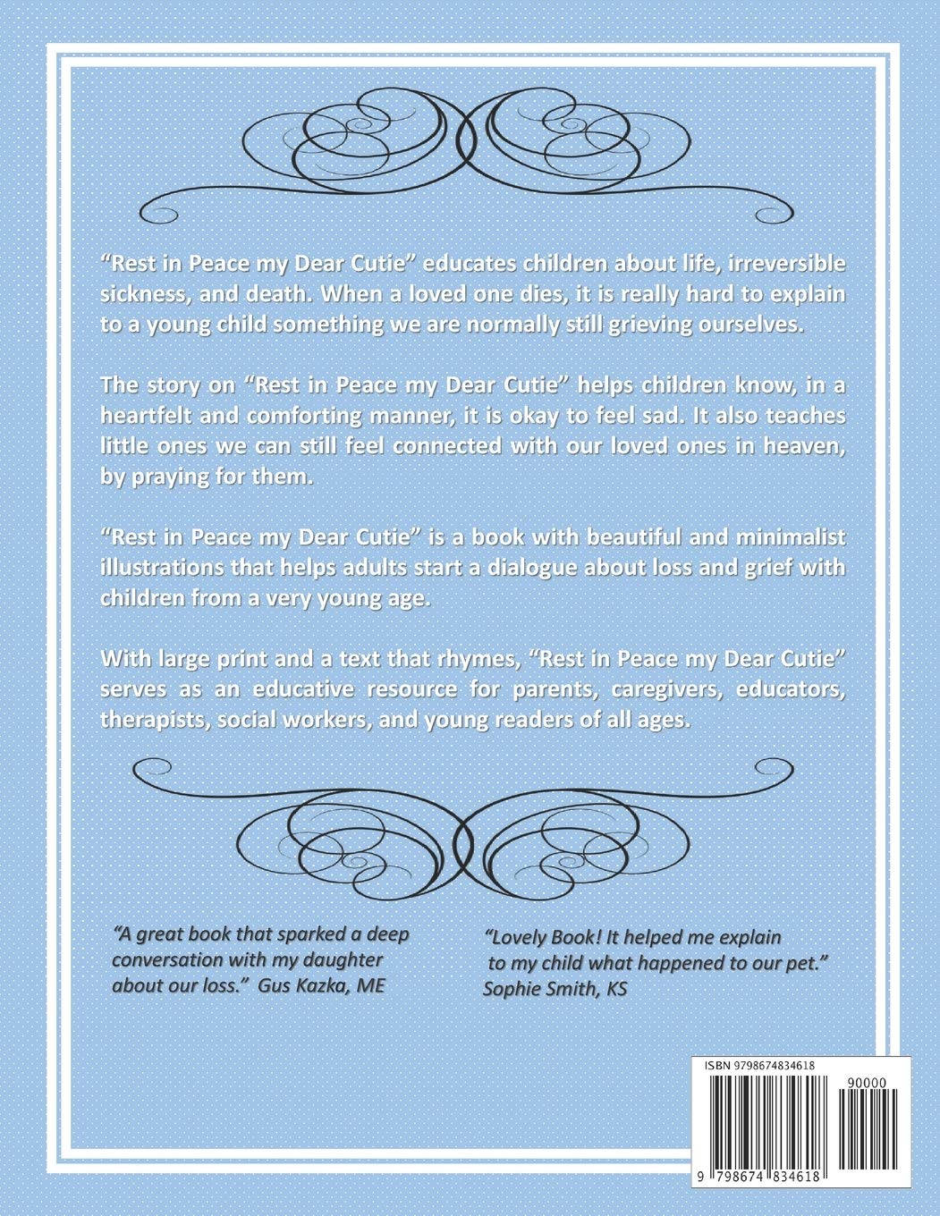 When a loved one dies, it is really hard to explain to a young child something we are still grieving ourselves.“Rest in Peace my Dear Cutie” helps children know, in a heartfelt and comforting manner, it is okay to feel sad.“Rest in Peace my Dear Cutie” also teaches little ones we can still feel connected with our loved ones in heaven, by praying for them.“Rest in Peace my Dear Cutie” is a book with beautiful and minimalist illustrations that helps adults start a dialogue about loss and grief with children from a very young age.With large print and a narration that rhymes, “Rest in Peace my Dear Cutie” serves as an educative resource for parents, caregivers, educators, therapists, social workers, and young readers of all ages.