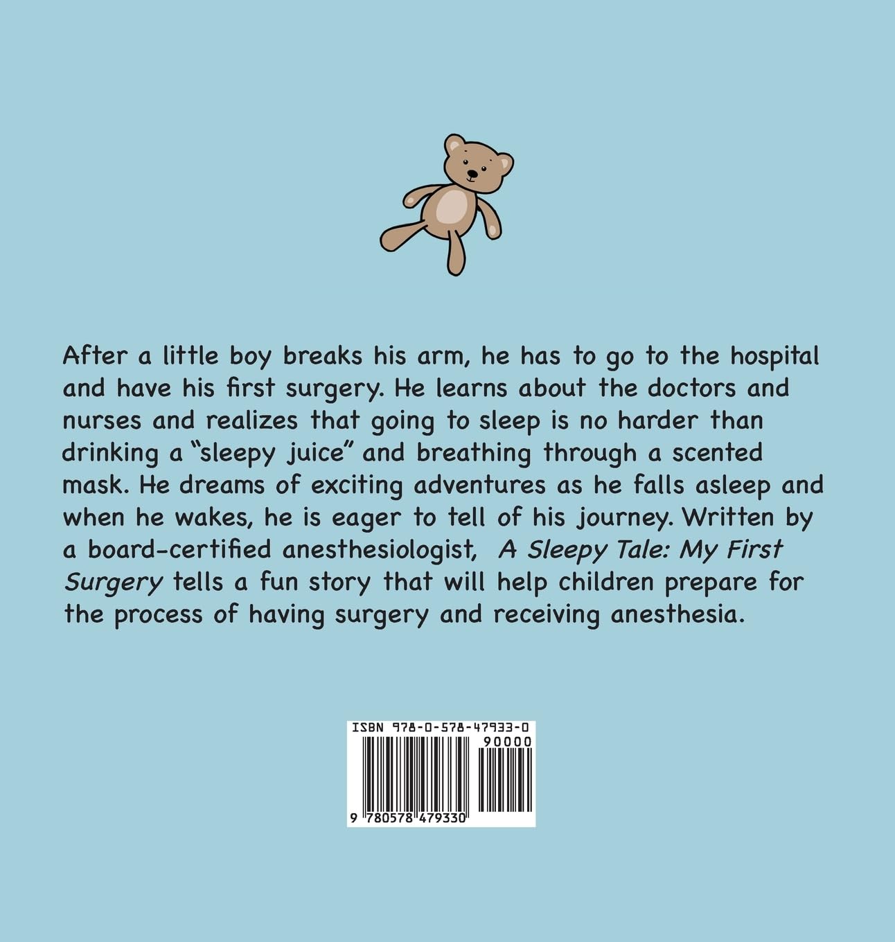 After a little boy breaks his arm, he has to go to the hospital and have his first surgery. He learns about the doctors and nurses and realizes that going to sleep is no harder than drinking a “sleepy juice” and breathing through a scented mask. He dreams of exciting adventures as he falls asleep and when he wakes, he is eager to tell of his journey. Written by a board-certified anesthesiologist, A Sleepy Tale: My First Surgery tells a fun story that will help children prepare for the process of having surgery and receiving anesthesia.