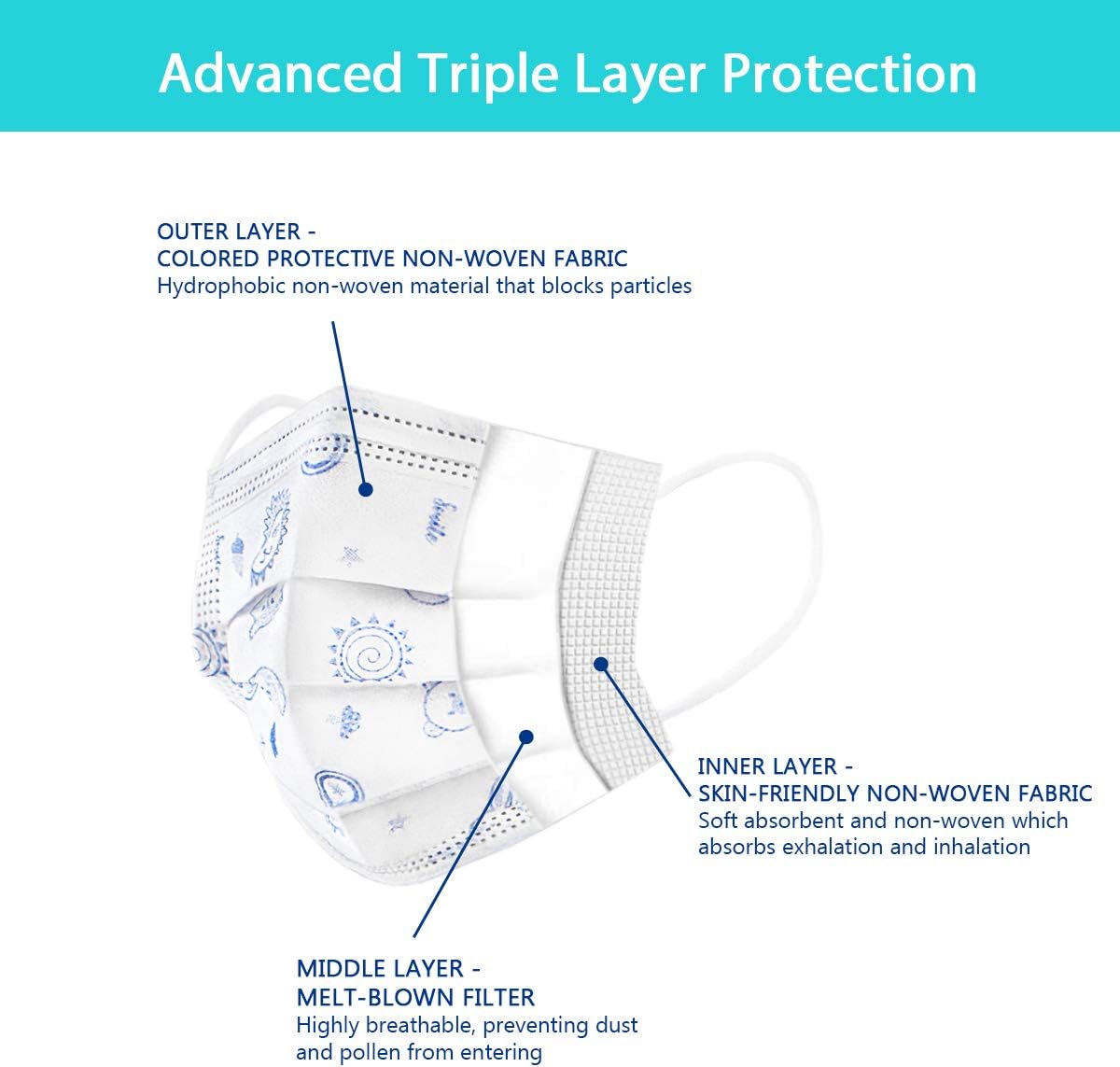 3-LAYER PROTECTION – Triple-ply filter: Outer Layer made of Hydrophobic non-woven material that blocks particles // Middle Layer made of melt-blown nanofiber filter which is highly breathable, preventing dust and pollen from entering // Inner Layer is soft absorbent and non-woven which absorbs exhalation and inhalation.