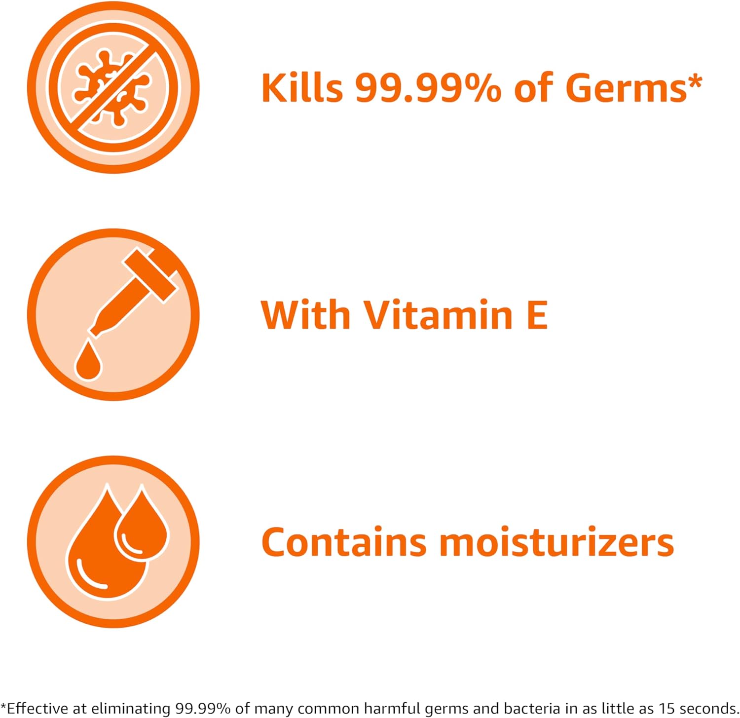 Kills more than 99.99% of common germs * (*Effective at eliminating more than 99.99% of many harmful germs and bacteria in as little as 15 seconds)