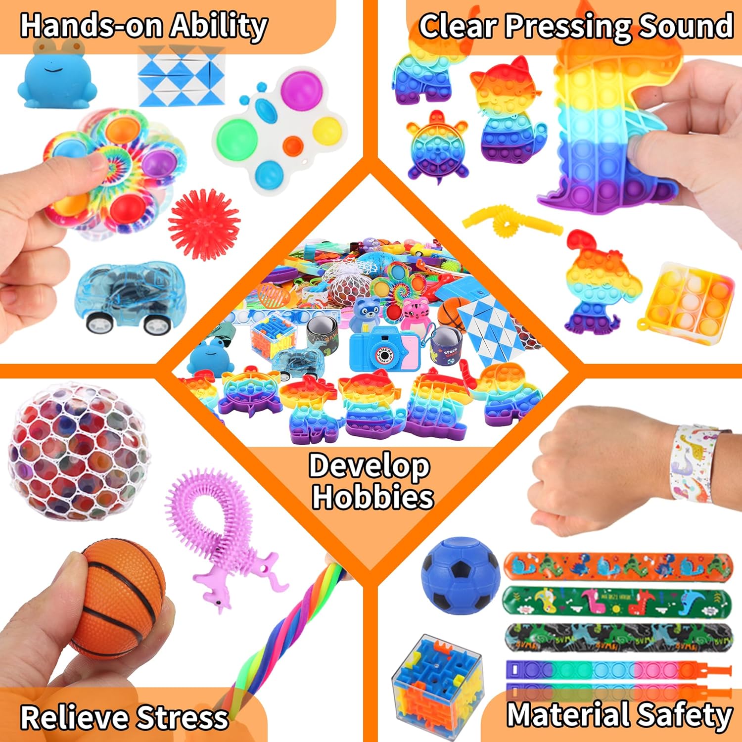 【PRODUCTS INCLUDE】Such as Animal fidget poppers(Dinosaur,Elephant,Turtle,Cat,Puppy,Giraffe),mini fidget keychain toys,fidget tubes*4,pop bracelet*2,butterfly poppers*1,pop fidget spinner*1,mochi squishy*4,sensory rings*5,chains*10,puzzle ball*4,sticky hands*2,building blocks*100,maze*2,tumblers*5,stickers*100,pull back car*5,fidget snake cube*2,slap bracelet*5,stretchy string*6,fidget spinners soccer ball*2,spinning top*50,spiky ball*10,etc