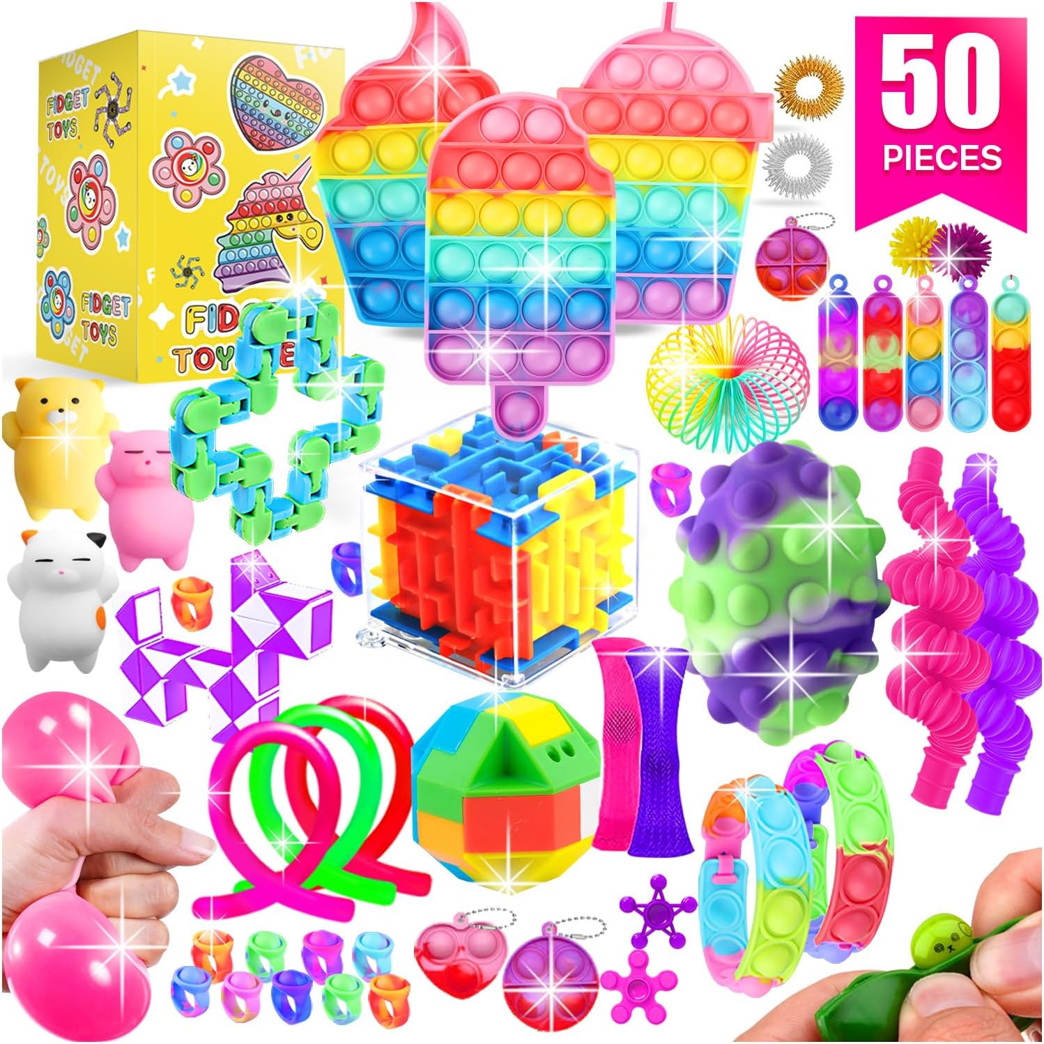 PACK OF 50: 3 Pop Bubbles, 1 Mesh Squishy Ball, 3 Mochi Squishies, 3 Stretchy String Fidgets, 1 Pop Ball, 8 Mini Pop Bubbles, 2 Pop Fidget Bracelets, 12 Pop Rings, 2 Spring Toys, 2 Sensory Rings, 2 Spiky Balls, 2 Marble Mesh Fidget Toys, 1 Snake Cube Twist, 1 Tracks Snap, 2 Puzzle Boxes, 1 Squeeze Soybean, 2 Fidget Spinners and 2 Pop Tubes.
