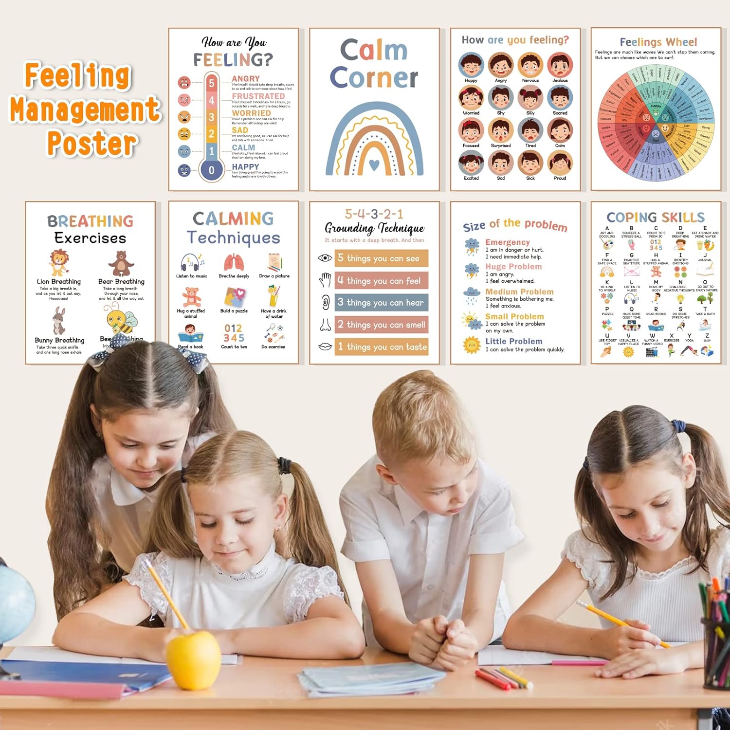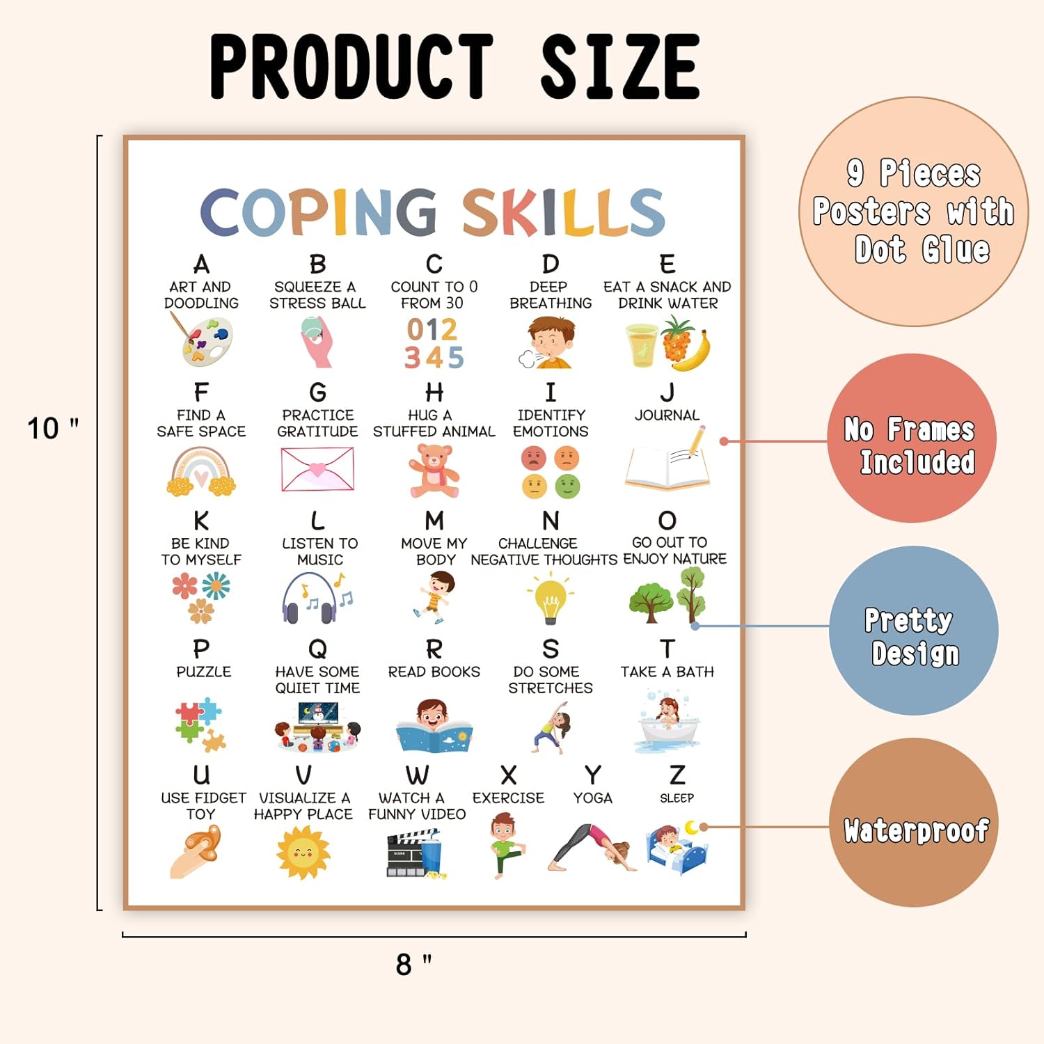 Calming Corner Poster Kit Includes: 9 pieces posters of 8in x 10in, including a calming corner title, feelings chart, calming techniques, feelings wheel, coping skills, breathing exercises and more. They are appropriate for you to decorate classroom, home and office with a suitable frame, the frame is not included in package.