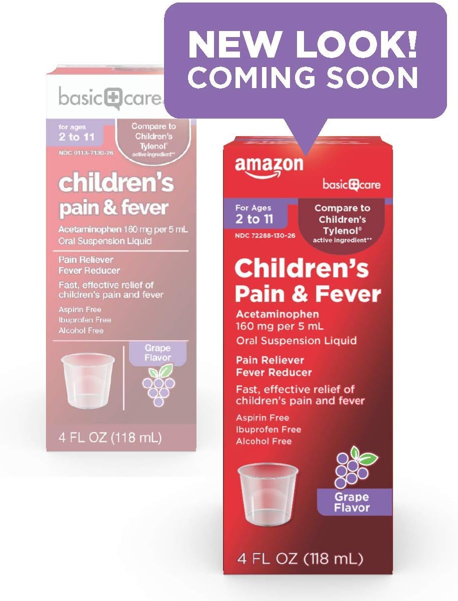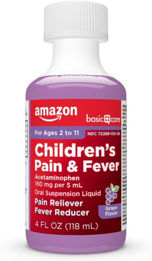 Amazon Basic Care Children’s Acetaminophen 160 mg per 5 mL Oral Suspension, Grape Flavor, Pain Reliever and Fever Reducer for Headache, Sore Throat and Toothache, 4 fl oz (Pack of 1)