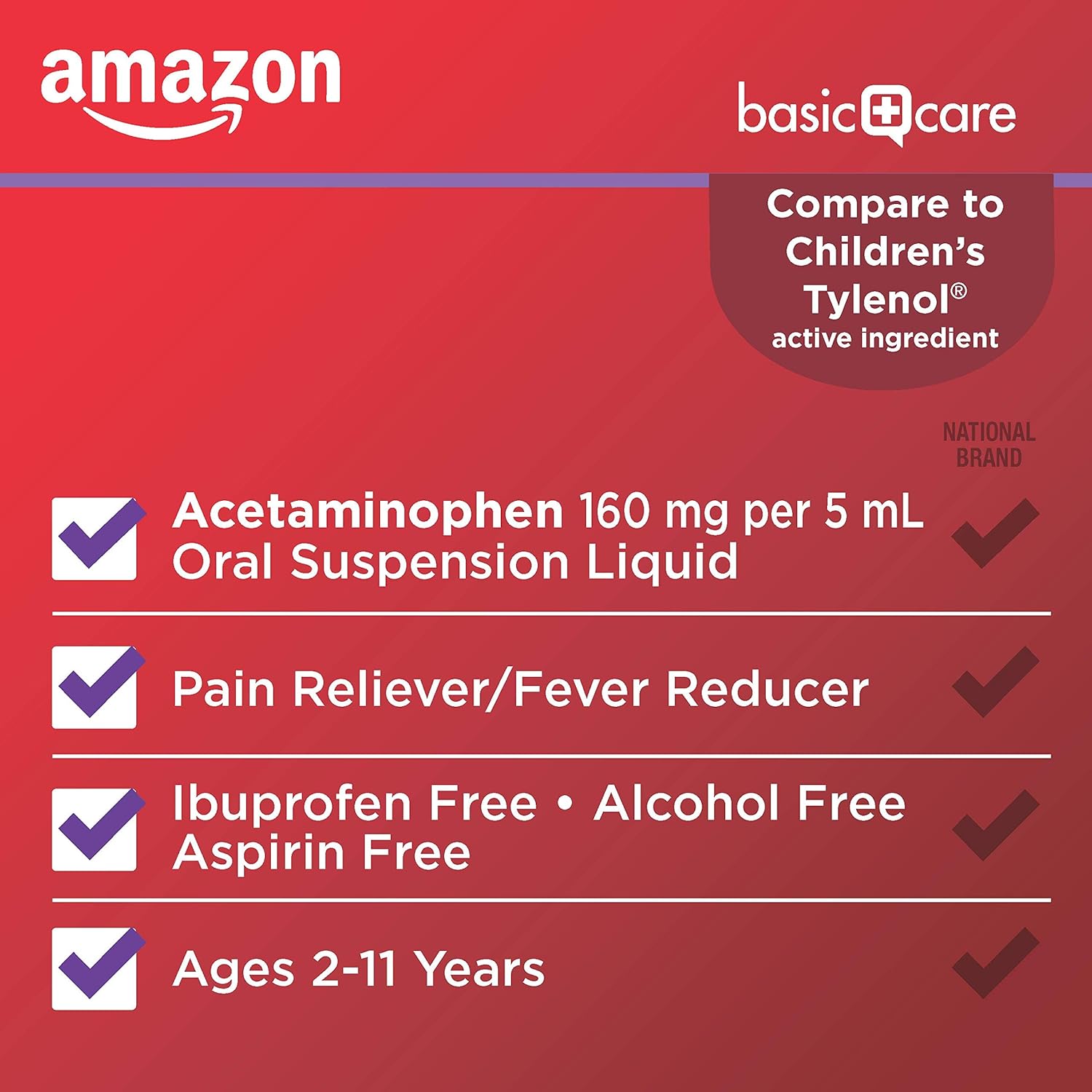 PAIN RELIEF FOR CHILDREN: Amazon Basic Care Pain & Fever, Children’s Acetaminophen 160 mg per 5 mL Oral Suspension, Grape Flavor, is aspirin free, ibuprofen free, alcohol free and gluten free