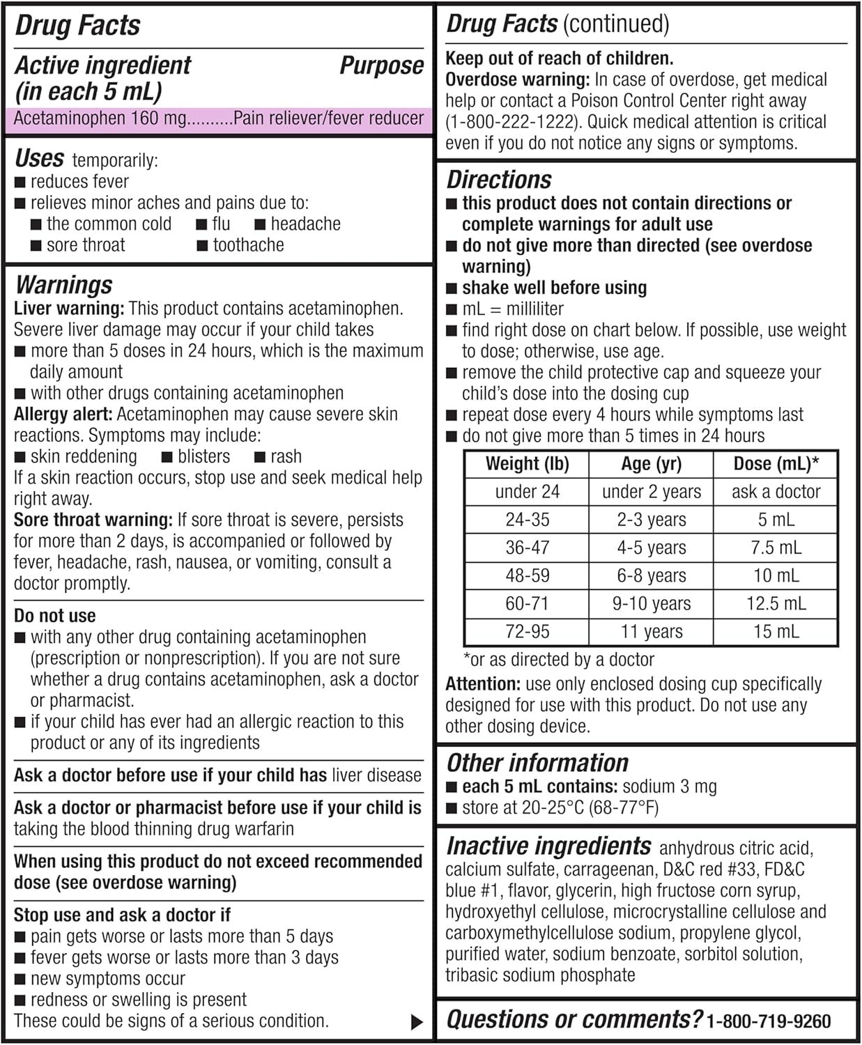 ACTIVE INGREDIENT: Amazon Basic Care Children’s Acetaminophen 160 mg per 5 mL Oral Suspension, Grape Flavor, contains acetaminophen 160 mg per 5 mL. Compare to the active ingredient in Children’s Tylenol Oral Suspension