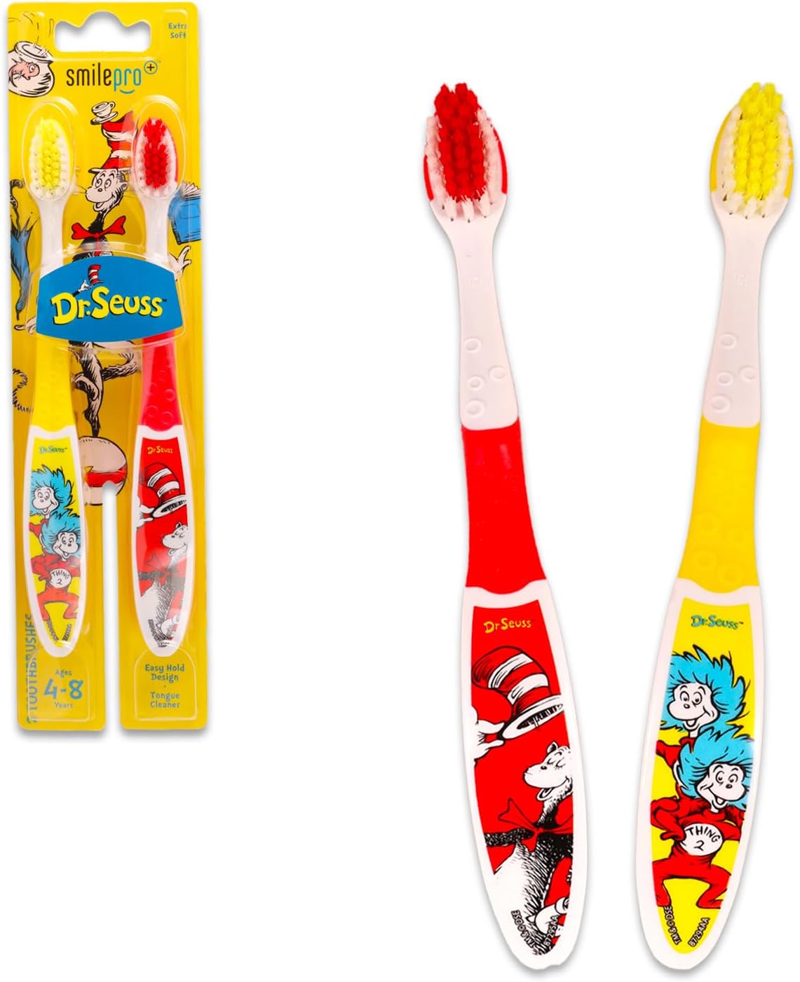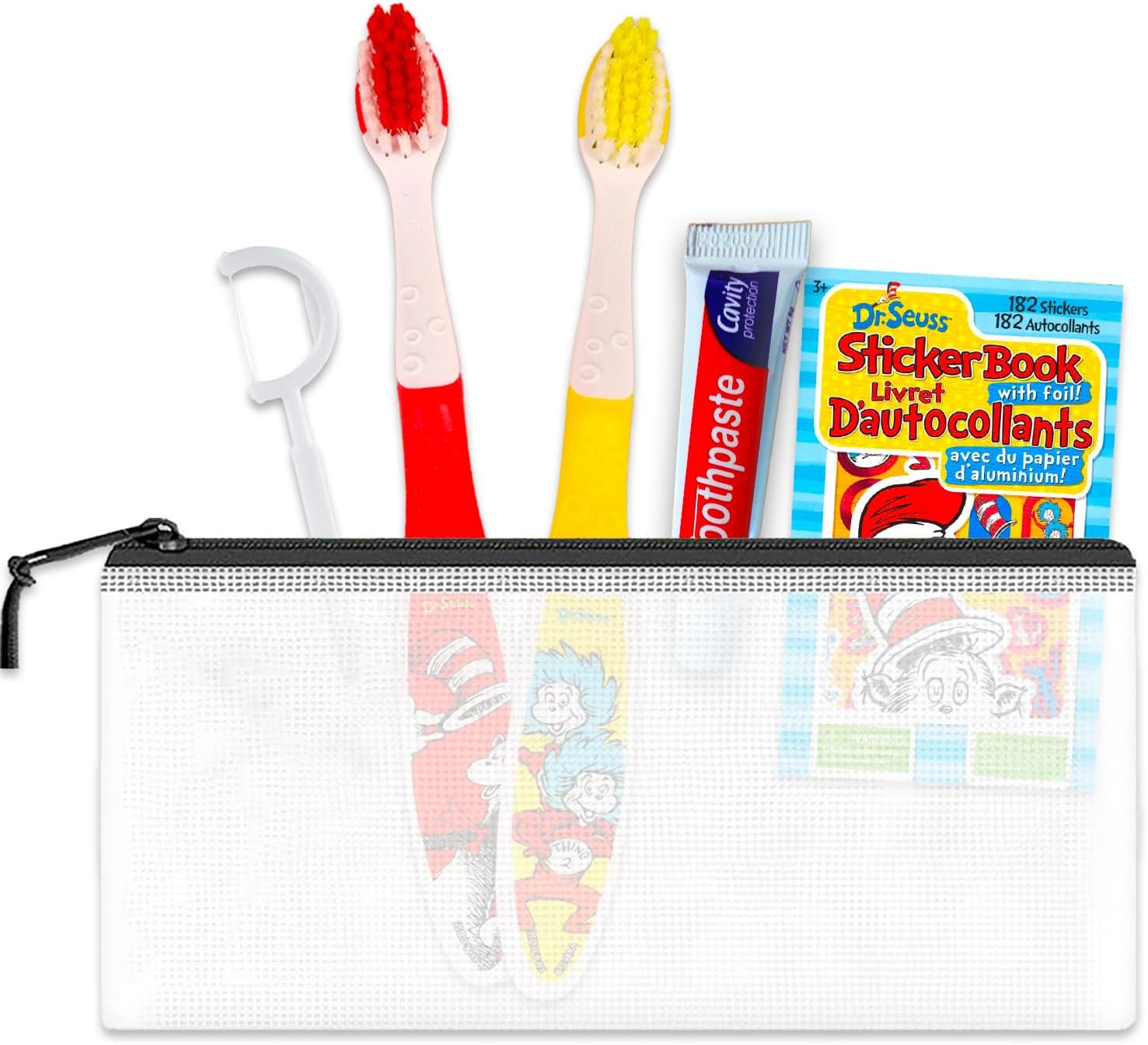 Dr. Seuss Oral Care Traveling Kit for Kids – Bundle with 2 Dr. Seuss Toothbrushes, Toothpaste, Floss, Travel Bag, More for Boys, Girls, Toddlers | Dr. Seuss Toothbrush Set. This Dr. Seuss travel oral care kit includes 2 Dr. Seuss toothbrushes, 1 tube of toothpaste,1 pack of floss, and 1 mini travel bag. Toothbrush styles may vary. Dr. Seuss toothbrush set is complete with everything your little one needs to upkeep their oral hygiene on vacation or while spending the night away from home. This Dr. Seuss toothbrush and toothpaste travel kit is TSA friendly, making this perfect to throw in your carry on for your next vacation or flight. Officially licensed Dr. Seuss oral care toothbrush set for kids also includes Dr. Seuss stickers.