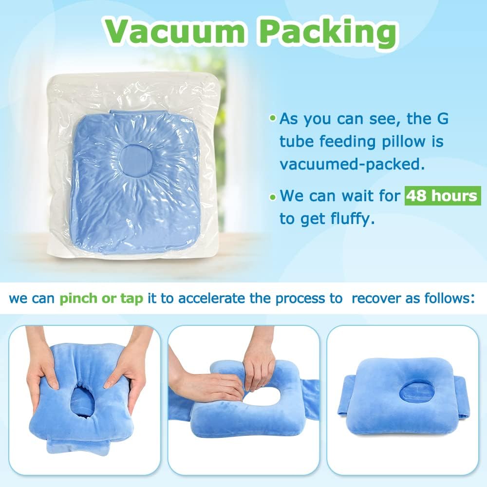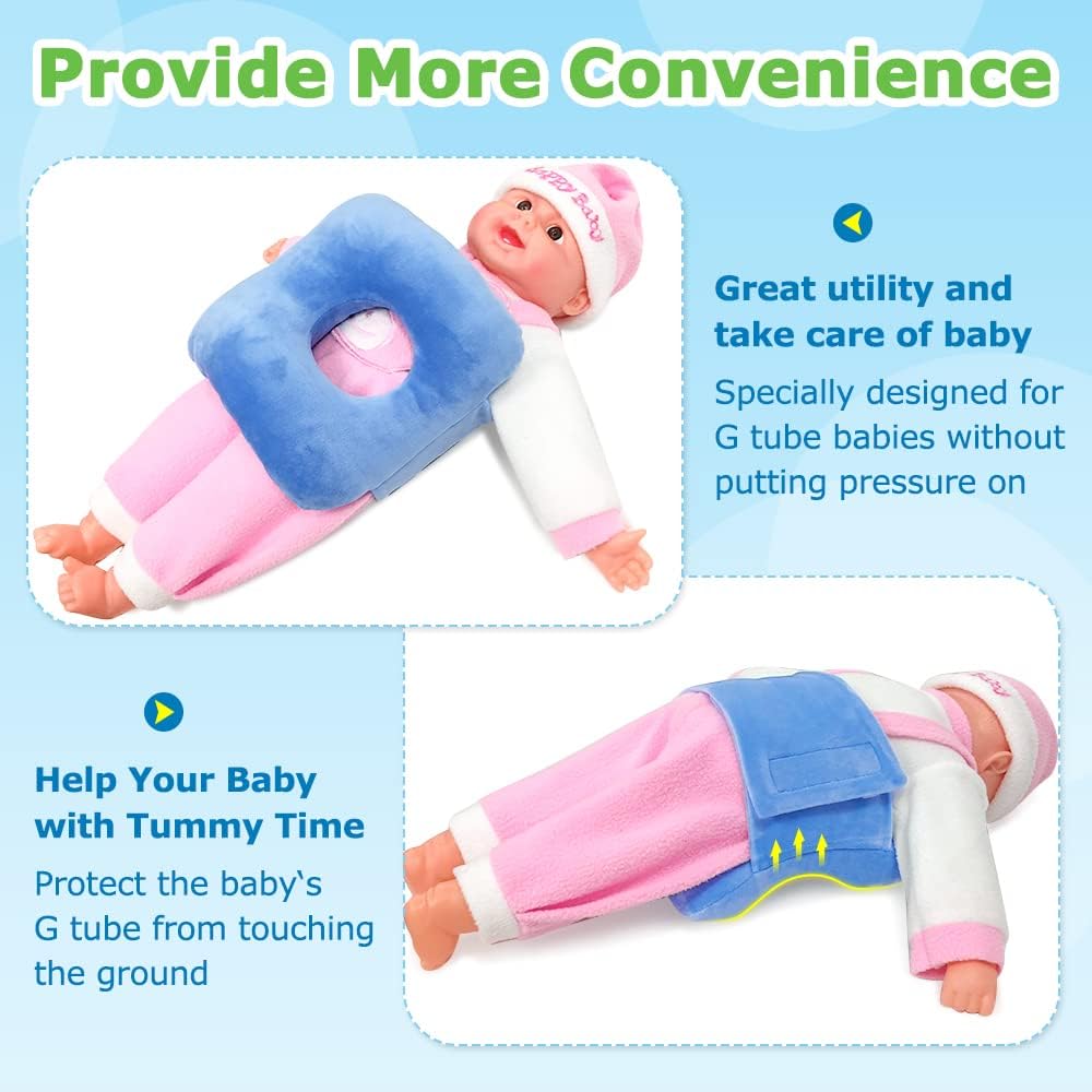 INTIMATE CARE The tummy time pillow is specially designed for G-tube babies. When lying down, the pillow can play a supporting role and protect the feeding tube from being squeezed. All infants need tummy time and it can be especially difficult to get our tube babies onto their bellies! This pillow works beautifully with a baby who is otherwise very resistant to tummy time! ENJOY THE TUMMY TIME Our pillow is bigger than other belt pad with a hole for babies, children and Kids, which is more comfortable and fluffier. Why G tube babies need our tummy time pillow? At first, tummy time is essential, it helps your baby develop motor skills that eventually lead to crawling. Then, G tube babies is special, they need a pillow like our G tube tummy time pillow to help them enjoy their tummy time without putting pressure on and causing irritation to his button. NOTE: 1.Never allow a baby to sleep on the support pillow. Pillow may be a possible suffocation hazard. 2.Please do not use in cribs, bassinets, playpens or beds. There should always be an adult present when the pillow is in use. 3.Please do not leave baby unattended. Improper use of this product could result in serious injury or death.