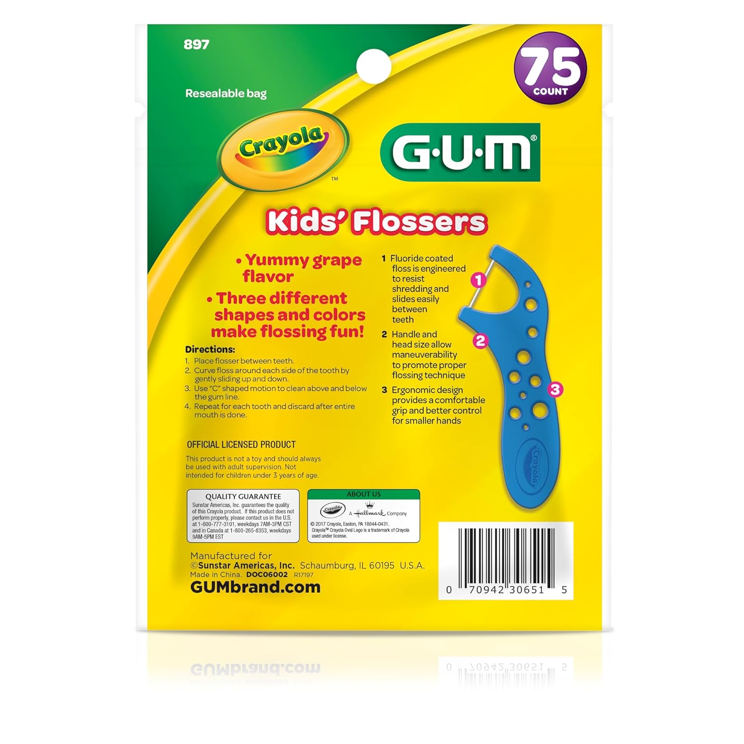 GUM Crayola flossers for kids turns between teeth cleaning into a fun experience for your children. Each kids flosser is crafted with an ergonomically designed handle that fits into little hands. Pre-loaded, shred resistant dental floss makes it easy for kids to clean between teeth to remove plaque and promote healthy teeth & gums. Each pack contains flossing picks in a variety of shapes and colors and comes with GUM dental floss in a delicious grape flavor. A fluoride coating helps build enamel to fight cavities.