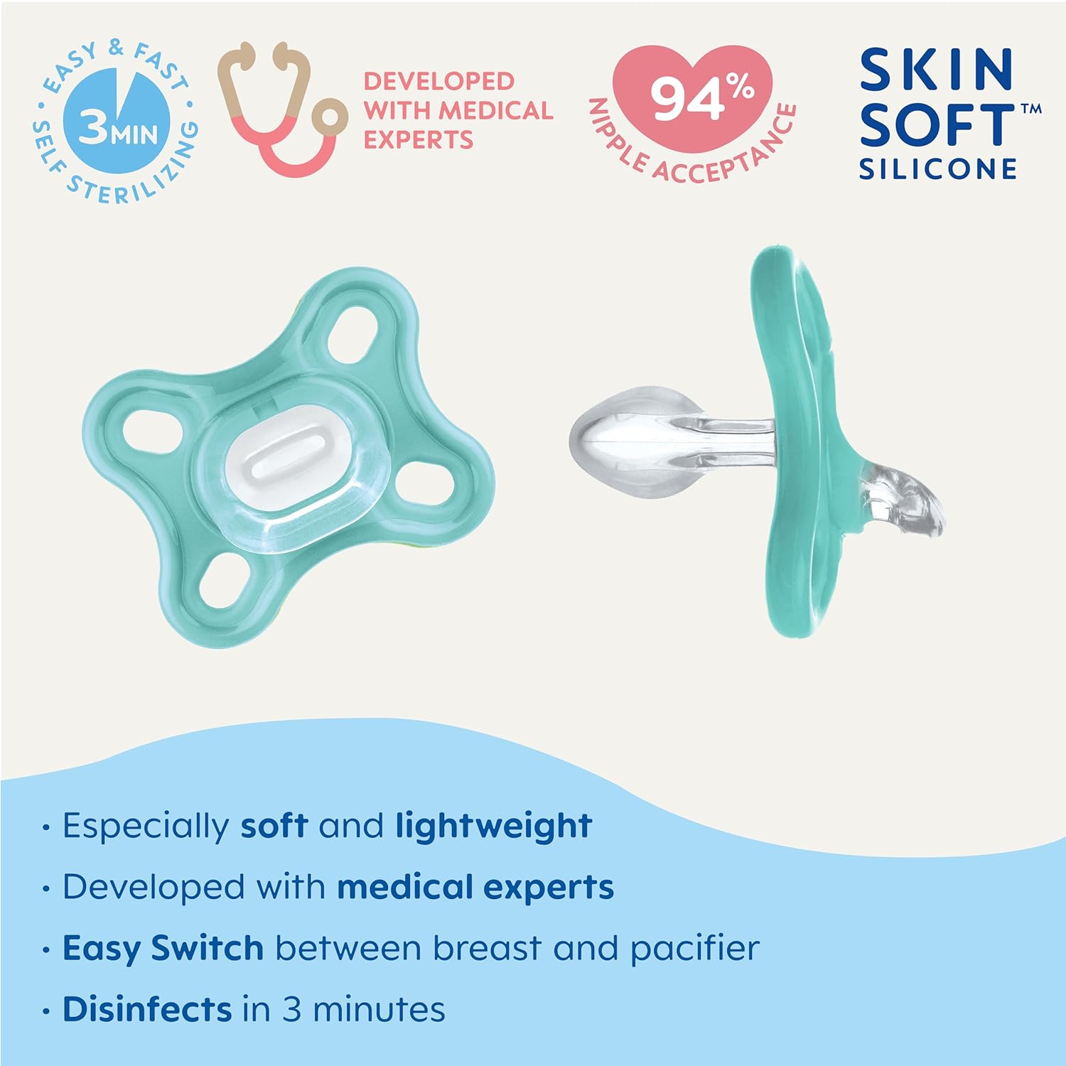 LIGHTWEIGHT DESIGN: Best pacifier for breastfed babies as it is 32% lighter than competitive one-piece silicone pacifiers, and specially designed for babies to keep the pacifier in their mouth.