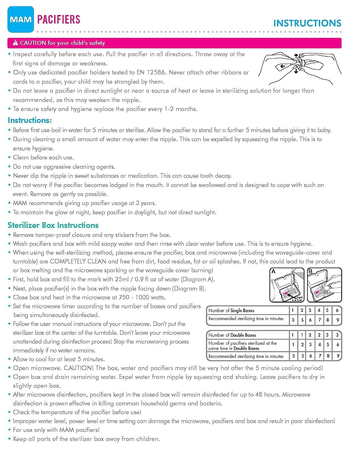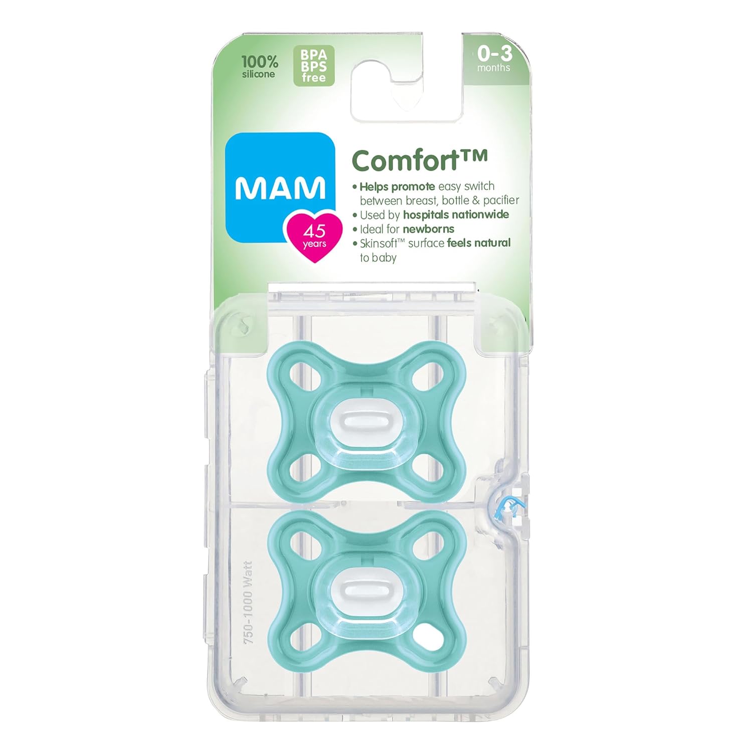 MAM Comfort newborn pacifiers have a one-piece construction made of full silicone, and are on average 36% lighter* than other competitive one-piece silicone pacifiers. The lightweight design and extra small nipple ensure that newborns can safely satisfy their natural suckling urge. The particularly small nipple is very well-accepted by babies and is optimally adapted to the special needs of newborns. The extra soft shield has four large air holes to ensure baby’s skin stays dry and comfortable, while the unique MAM shape leaves plenty of room for baby’s nose to breathe. The convenient handle is great for attaching a clip to keep baby’s pacifier always in reach, and even if it does take a tumble you know it’s only a few minutes away from being germ-free again. Included in this set is a handy sterilizer case that you can pop in the microwave. Sterilize baby’s MAM pacifier in the microwave using the convenient MAM self-sterilizing storage case: Fill pacifier case with water. Place pacifier in the pacifier case with the nipple facing down. Follow Start Pacifier package instructions for microwave setting. Cool completely before use. Microwave disinfection is proven effective in killing common household germs and bacteria, and pacifiers kept in the closed box will remain disinfected for up to 48 hours. *Scientific reports from the WILD Hi-Precision Institute (Austria) confirm that the MAM Comfort is 36% lighter than the average weight of all other tested one-piece silicone pacifiers. Measured weight results: 8.2 g – 18.6 g