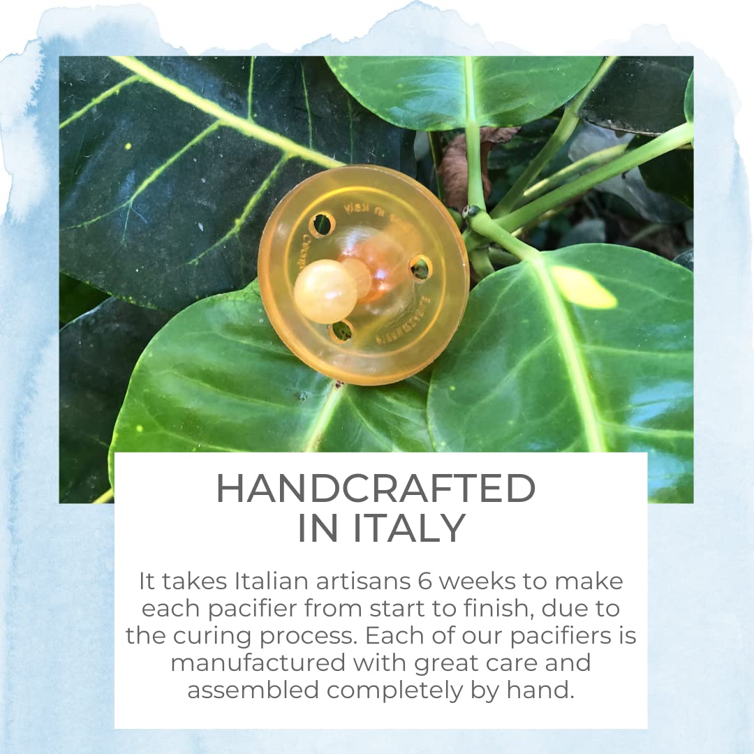 HANDCRAFTED IN ITALY: It takes Italian artisans 6 weeks to make each Simply Rubber Pacifier from start to finish, due to the curing process. Each of our pacifiers is unique, manufactured with great care and assembled completely by hand.